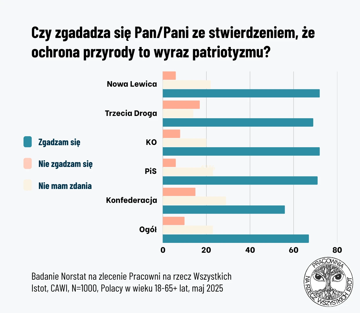 Różnice między poglądami wyborców Koalicji 15 października a zwolennikami takich opozycyjnych partii prawicowych jak Prawo i Sprawiedliwość czy Konfederacja nie są duże. 71% wyborców, którzy w 2023 głosowali na Koalicję Obywatelską, Trzecią Drogę lub Nową Lewicę uważa, że ochrona przyrody to wyraz patriotyzmu. Niewiele mniej, bo uważa tak 66% wyborców PiS i Konfederacji.
